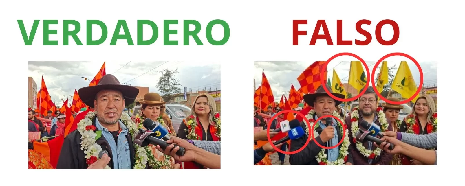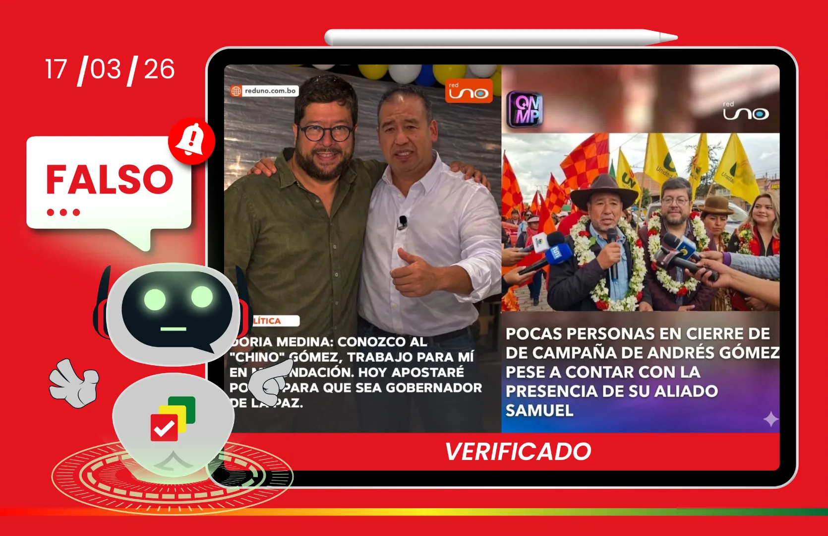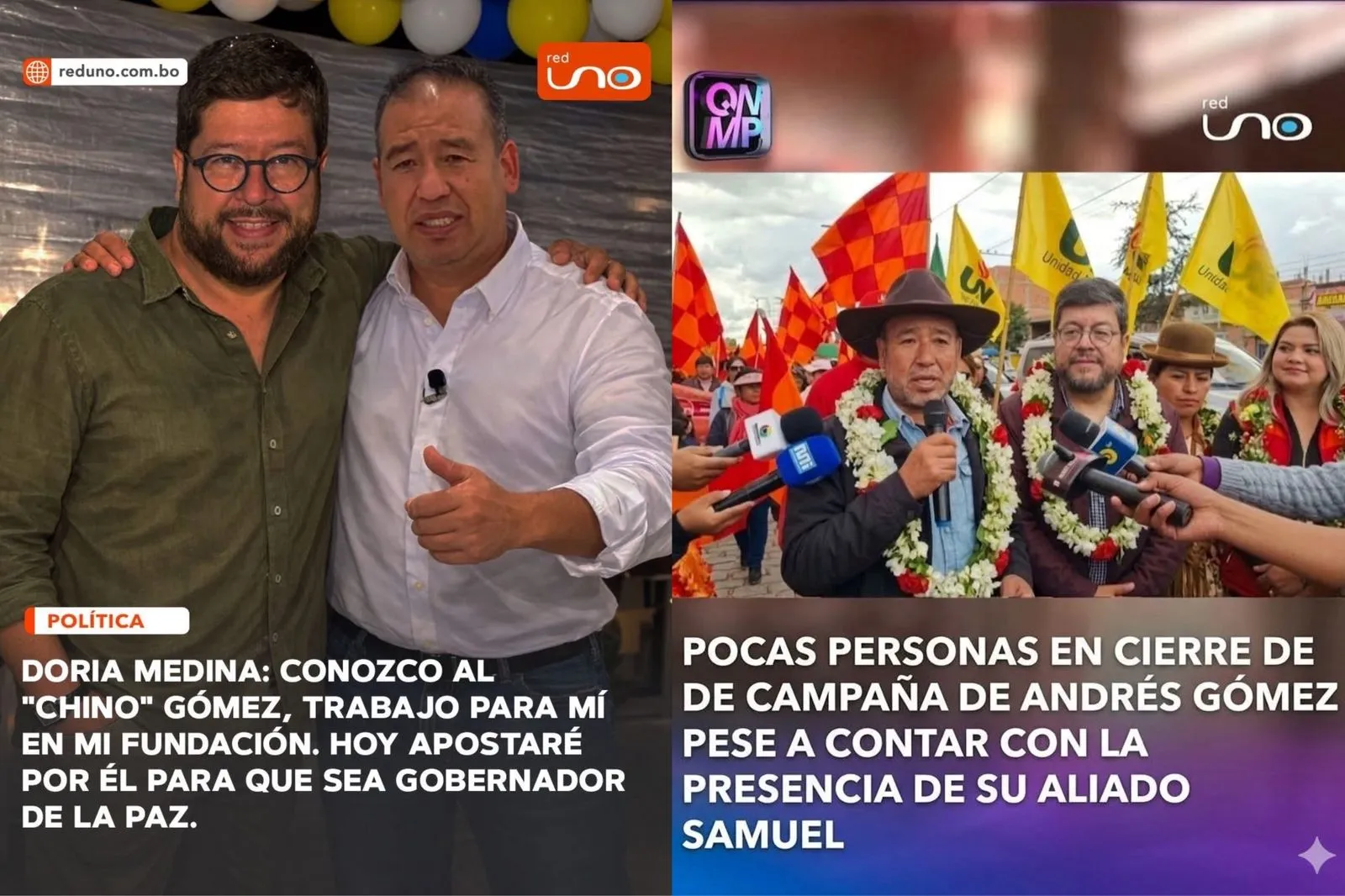 En conclusión, el contenido es falso. Utiliza fotografías atribuidas a Red Uno que han sido manipuladas y generadas con inteligencia artificial, mostrando a Andrés Gómez junto a Samuel Doria Medina en escenas que no figuran en ninguna publicación oficial del medio.
