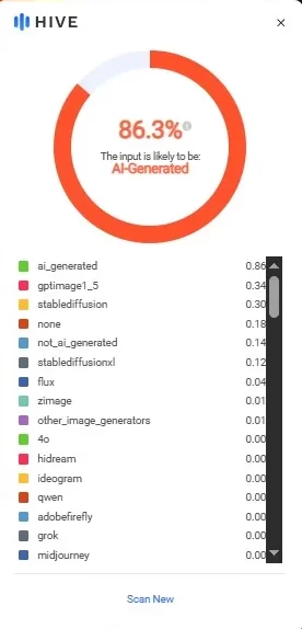 Tras rastrear las imágenes difundidas, estas fueron analizadas con herramientas de detección de contenido generado con inteligencia artificial, las cuales determinaron que fueron creadas con esta tecnología con una probabilidad superior al 85 %.