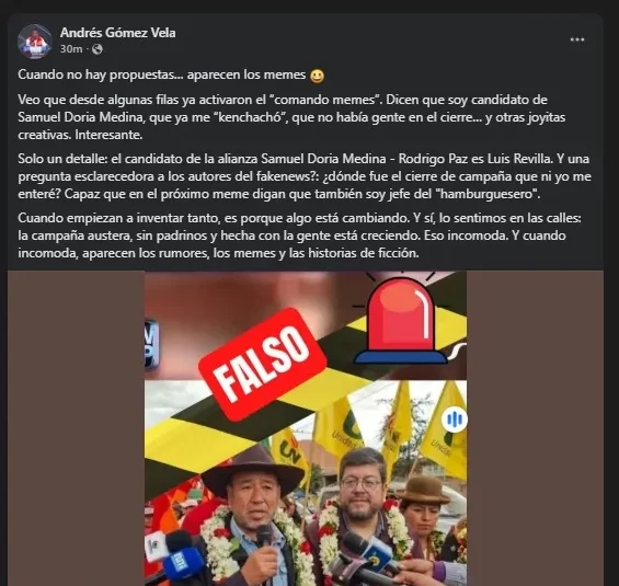 Asimismo, Andrés Gómez publicó en su cuenta oficial de Facebook que este contenido es falso, desmintiendo cualquier vínculo con Samuel Doria Medina y aclarando que se trata de contenido manipulado.