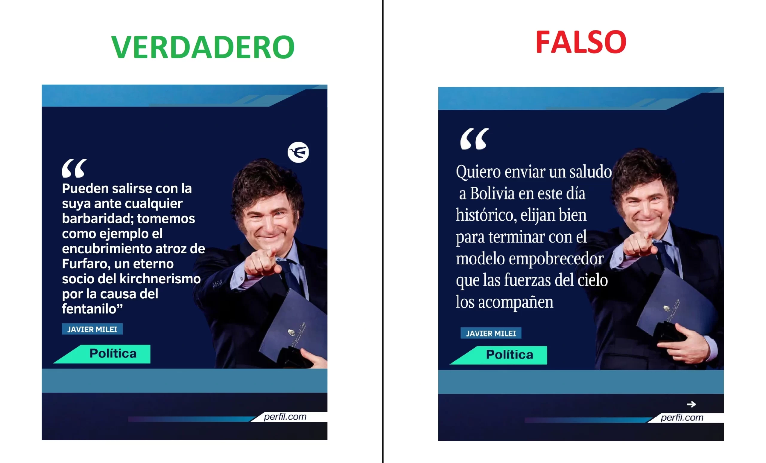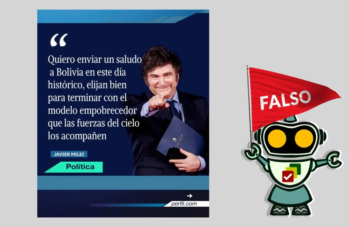 Desde la cuenta de Facebook Ramiro Sánchez se comparte una imagen con la línea gráfica del medio argentino Perfil, en la que se afirma que el presidente Javier Milei envió un mensaje dirigido a los bolivianos por la segunda vuelta electoral. Sin embargo, esta información es falsa.