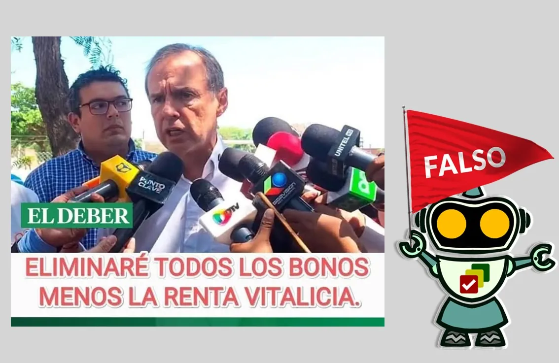 En redes sociales (1, 2 y 3) circula una imagen en la que se indica que Jorge Tuto Quiroga, candidato presidencial por Alianza Libre, habría afirmado que eliminaría todos los bonos sociales excepto la renta vitalicia. Sin embargo, este contenido es falso.