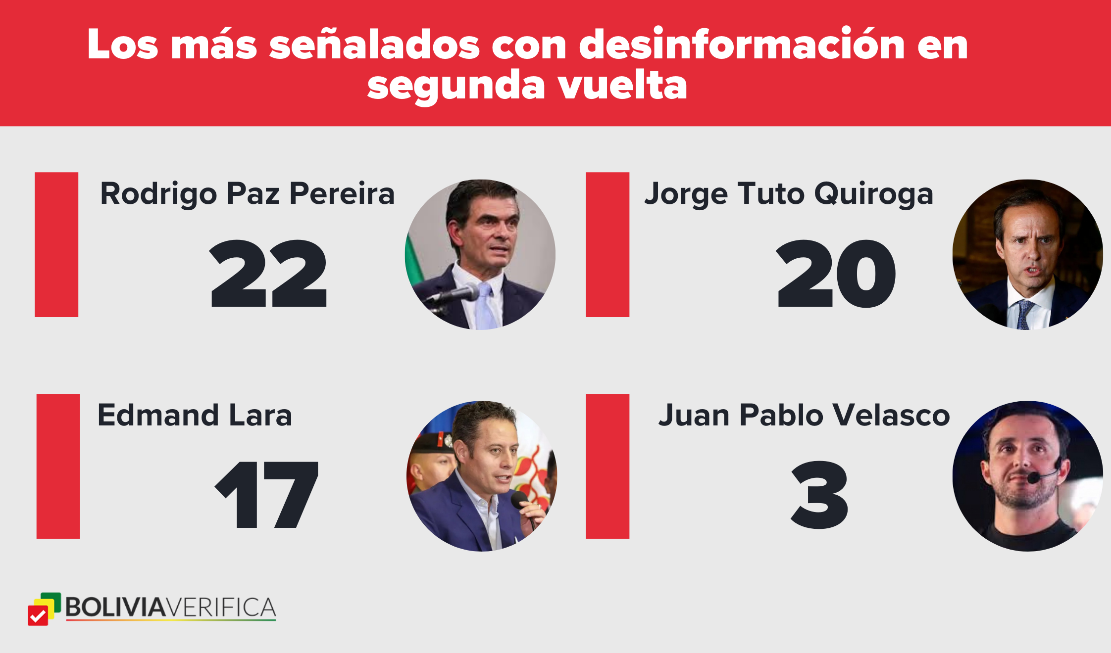 En la segunda vuelta, los principales blancos de la desinformación fueron Rodrigo Paz Pereira y, en segundo lugar, Jorge Quiroga. Ambos candidatos presidenciales se enfrentaron en esta instancia para determinar al primer mandatario del país.