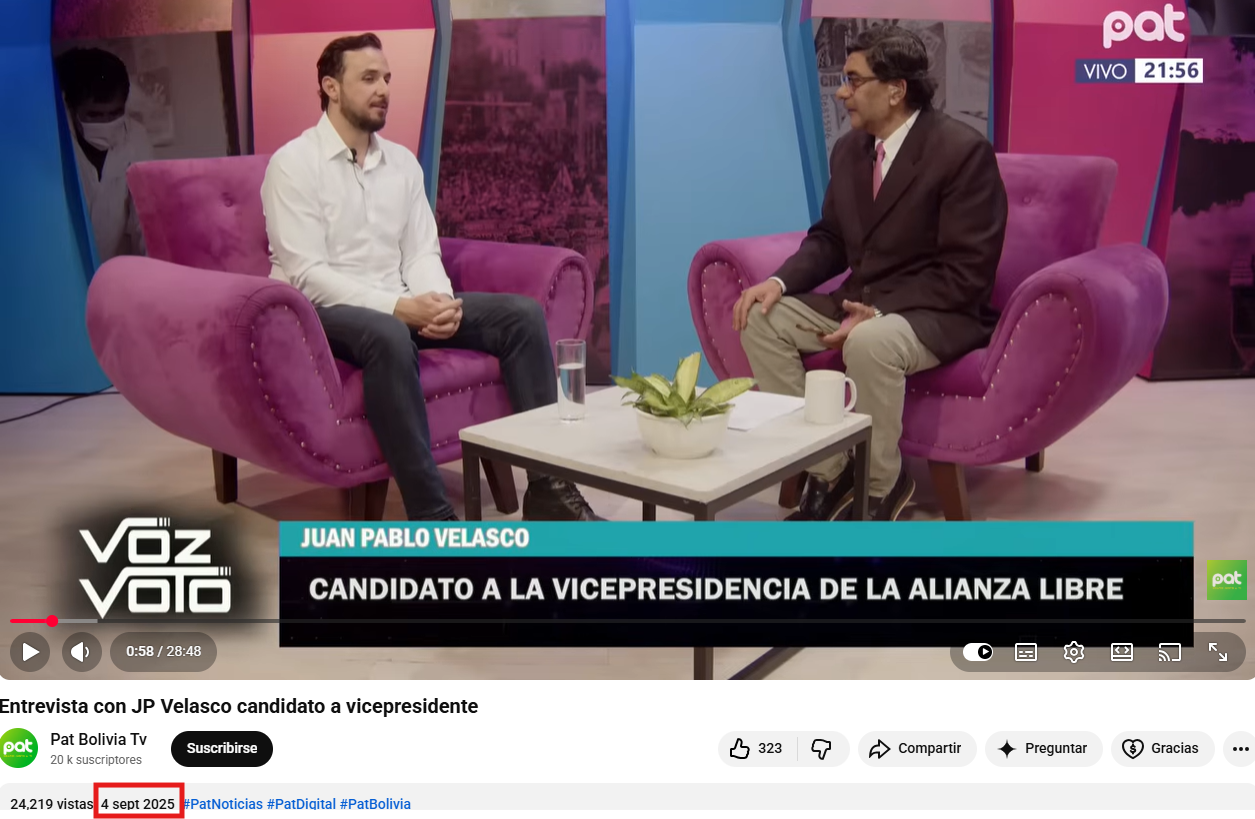 El equipo de Bolivia Verifica buscó el origen del video y estableció que el material corresponde al 4 de septiembre de 2025, cuando Juan Pablo Velasco participó en el programa “Voz y Voto” de la red PAT, en el marco de las elecciones generales de ese año, en las que era candidato a la vicepresidencia.