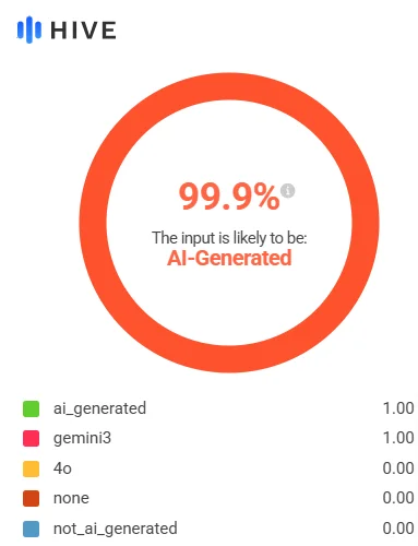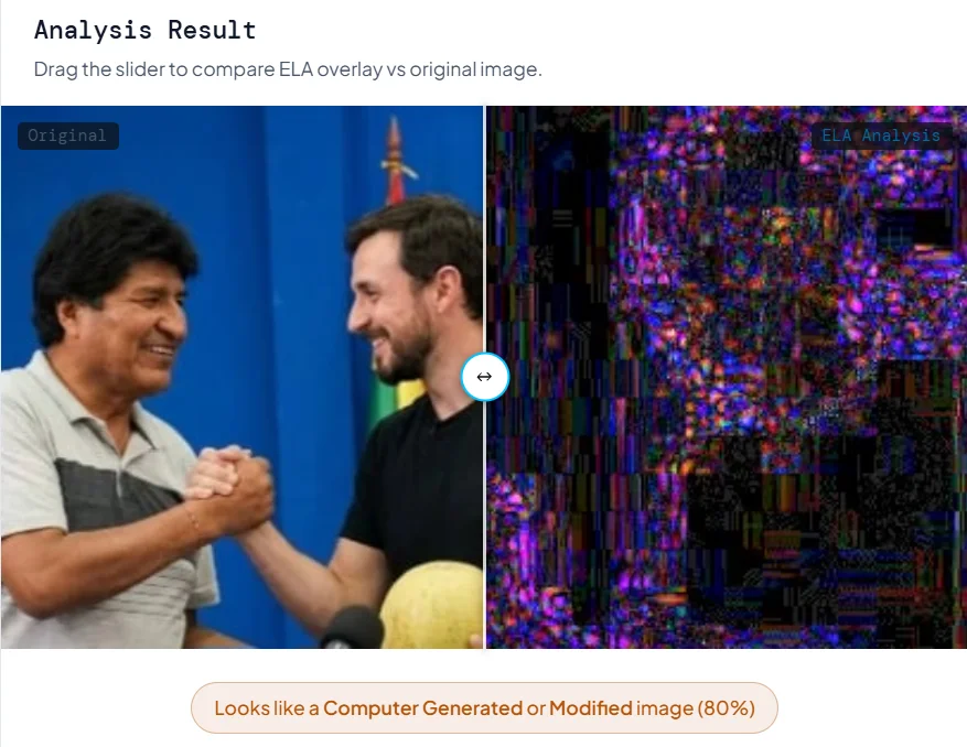 Para verificar su autenticidad, Bolivia Verifica sometió la imagen a herramientas de detección de contenido sintético. La herramienta Hive Moderation arroja un 99,9% de probabilidad de que la imagen fue generada con inteligencia artificial, mientras que Fake Image Detector estima una probabilidad del 80% en el mismo sentido.