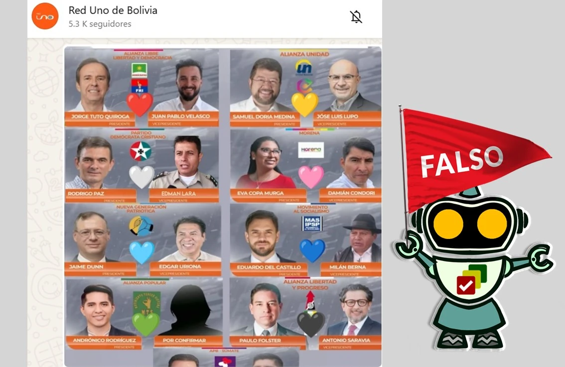 La encuesta con el citado texto es difundida en un canal que lleva el nombre “Red Uno de Bolivia”, donde los usuarios pueden participar con su voto al colocar un emoji de corazón con el color del frente de su preferencia.