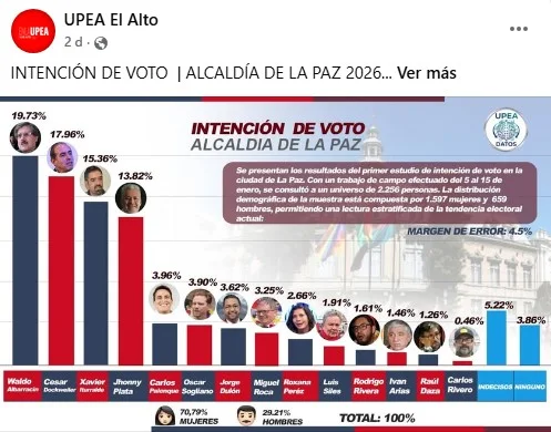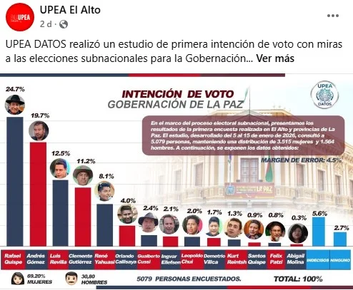 A través de la página de Facebook UPEA El Alto, se difundieron tres resultados estudios de opinión sobre la intención de voto para la Gobernación de La Paz y las alcaldías de La Paz y El Alto (1, 2 y 3). Sin embargo, estas encuestas son falsas.