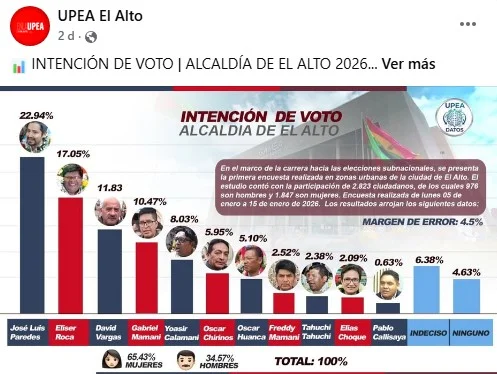 Esta primera gráfica fue compartida a las 11:00, apenas una hora después, la misma página difundió una segunda imagen con supuestos resultados de intención de voto para la Alcaldía de El Alto. En este nuevo material, se situaba en primer lugar a José Luis Paredes con el 22,94 %, seguido de Eliser Roca con el 17,05 % y David Vargas con el 11,83 %, además de otros ocho postulantes con cifras menores.