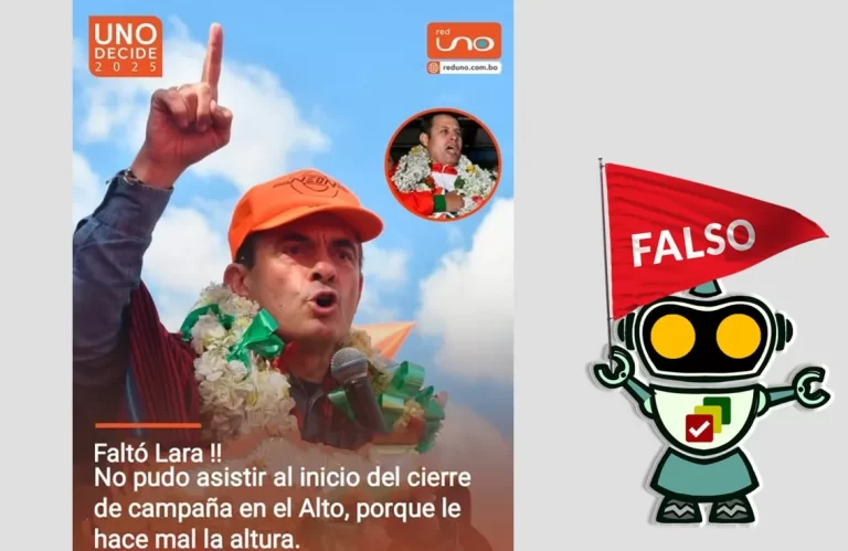 El titular de un post de la Red Uno fue alterado. En el texto verdadero informa: «¡Faltó Lara! Rodrigo Paz cierra campaña del PDC en El Alto rumbo al balotaje del 19 de octubre».ContentsMonitoreo ¿Por qué Lara no asistió al cierre de campaña?Cierres de campaña A través de la cuenta Roboré Te Informa, en Facebook, se … Sigue leyendo Lara no asistió al cierre de campaña en La Paz por problemas de salud de su esposa, no por la altura