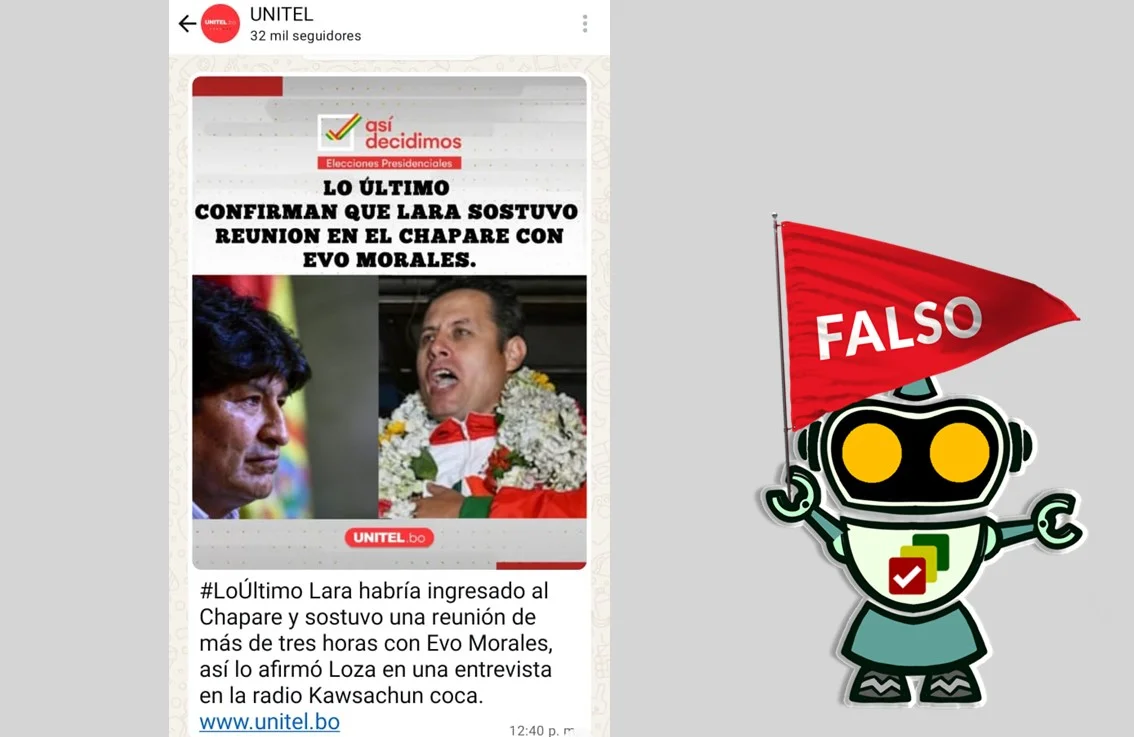La imagen que circula con el sello de Unitel es falsa. No existe evidencia de que Lara se haya reunido con Evo Morales en el Chapare. Morales sí mencionó que sectores afines votaron por Lara, pero no brindó un apoyo oficial.