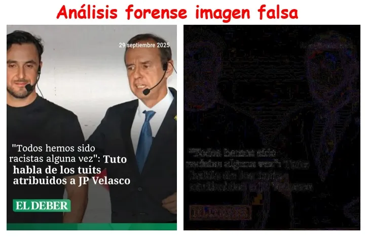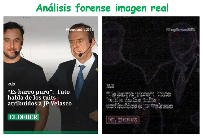 En un análisis forense, se muestra que en la versión alterada el color de fondo es casi imperceptible y únicamente resaltan las letras modificadas. En cambio, en la imagen original se distinguen claramente los contornos blancos del texto, lo que demuestra la diferencia entre el material auténtico y el manipulado.