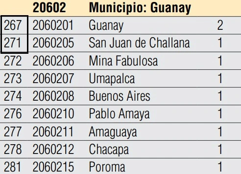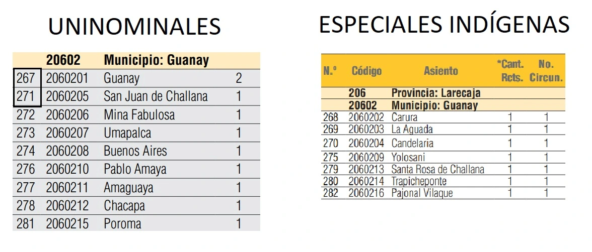 Castro descalificó estas explicaciones y videos, afirmando que «buscan cinco pies al gato para justificar lo injustificable». Además, señaló un tercer detalle: los nombres de los asientos electorales y la cantidad de recintos en los mapas de 2020 y 2025 no coinciden. Por ejemplo, Tucainty aparece en el mapa de 2025 para circunscripciones especiales indígenas, pero no figura con ese nombre en el documento de 2020. Pero la explicación es la siguente: