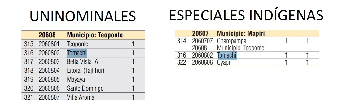 Castro también afirmó la duplicidad de asientos electorales, citando como ejemplo el asiento Tomachi (con numeración 2060802), el cual, según su denuncia, figura tanto en las listas de circunscripciones uninominales como en las de especiales indígenas.