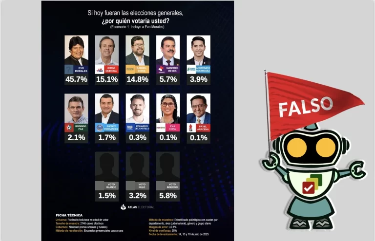 Los resultados de encuestas que difunde Atlas Electoral no tienen aval del Órgano Electoral, por lo que carecen de imparcialidad. En más de una ocasión, Bolivia Verifica desmintió sus publicaciones.