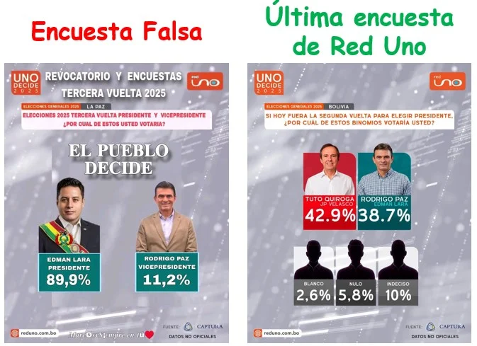 Mediante la página Studios Red Bolivia, en Facebook, se compartió una imagen con el logotipo de Red Uno en la presenta el resultado de una encuesta titulada «¿Por cuál de ustedes votaría?», y Edmand Lara figura como presidente con un 89,9% y Rodrigo Paz como vicepresidente con 11,2%. Empero, este contenido es falso.