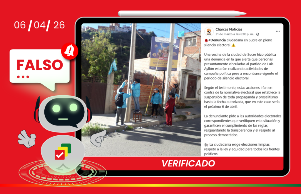 Según una denuncia difundida por Facebook, la alianza habría infringido el silencio electoral, pero esto no es cierto. ContentsNo fue una campaña políticaFotografías enviadas por la presidente del D-4Campaña de limpiezaSilencio electoral Redacción: Adriana Olivera Según una denuncia difundida por la página Charcas Noticias, se señala que personas afines a la Alianza Gente Nueva «hicieron campaña … Sigue leyendo No, Gente Nueva no estaba haciendo campaña política, sino de limpieza