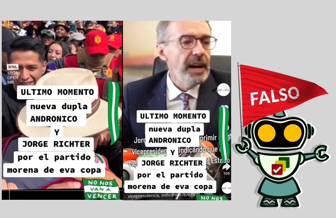 A través de TikTok se asegura que el presidente del Senado Andrónico Rodriguez hará dupla con el exvocero presidencial Jorge Richter en la fórmula del Movimiento de Renovación Nacional (Morena), partido creado a iniciativa de la alcaldesa de El Alto Eva Copa. Este dato fue visto miles de veces mediante TikTok, pero esta versión es falsa. Hasta este 31 de mayo de 2025, Morena no anunció ningún ajuste a su binomio presidencial conformado por Copa y Richter.