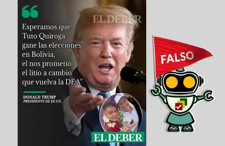 En Facebook circula una publicación falsa que atribuye al presidente estadounidense una frase sobre el candidato presidencial de Alianza Libre y utiliza el logo del diario El Deber. El medio confirmó que se trata de un material falso.ContentsImagen falsaEl Deber no publicó esta informaciónNo hay registro de que Trump haya pronunciado esas declaraciones Por Facebook … Sigue leyendo No hay evidencia de que Trump haya mencionado que espera que Quiroga gane las elecciones