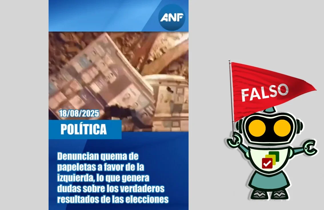 Un video que circula en TikTok muestra papeletas electorales marcadas a favor de Eduardo del Castillo (MAS) y Andrónico Rodríguez (Alianza Popular) siendo quemadas. Sin embargo, un análisis realizado por Bolivia Verifica estableció que se trata de una producción montada para generar dudas sobre los resultados preliminares y el avance del cómputo oficial de los comicios del domingo 17 de agosto. Por tanto, este contenido es falso.