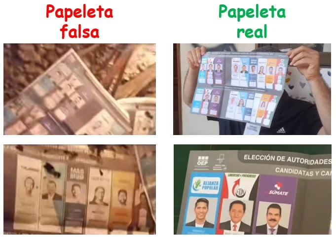 Además, se contrastaron las imágenes de las papeletas que se muestran en la grabación con las boletas originales y se detectó que las primeras presentan un borde blanco que no corresponde al material electoral oficial distribuido por el Tribunal Supremo Electoral (TSE).
