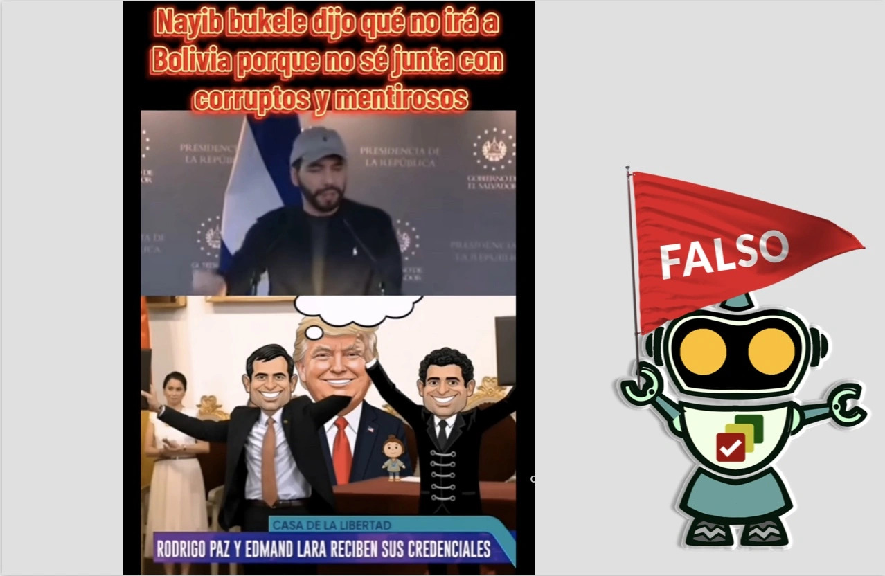 Una publicación difundida en TikTok indica que el presidente de El Salvador Nayib Bukele Ortez no viajó al acto de posesión de Rodrigo Paz en Bolivia por considerar a sus madatarios «corruptos y mentirosos»; sin embargo, el dato es falso. El video difundido es del 12 de noviembre de 2019.