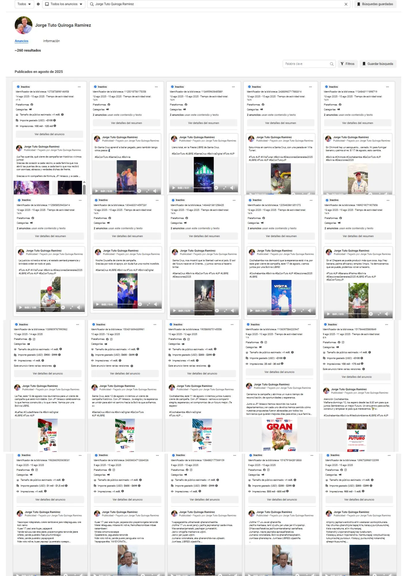 Bolivia Verifica revisó los videos publicitados en la cuenta oficial de Facebook de Quiroga entre el 12 de junio y el 15 de agosto, fecha de su último anuncio. La información fue obtenida de la Biblioteca de Anuncios de Meta.