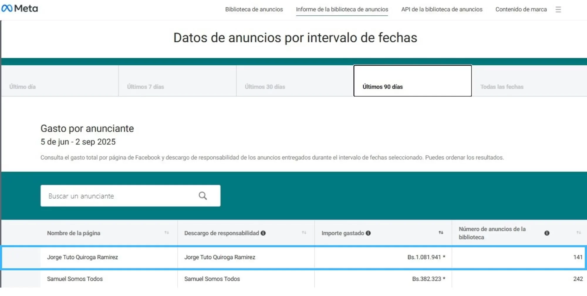 El monto registrado fue invertido en los últimos 90 días, del 5 de junio al 2 de septiembre, en 141 anuncios, según la información que arroja la Biblioteca de Anuncios de Meta.