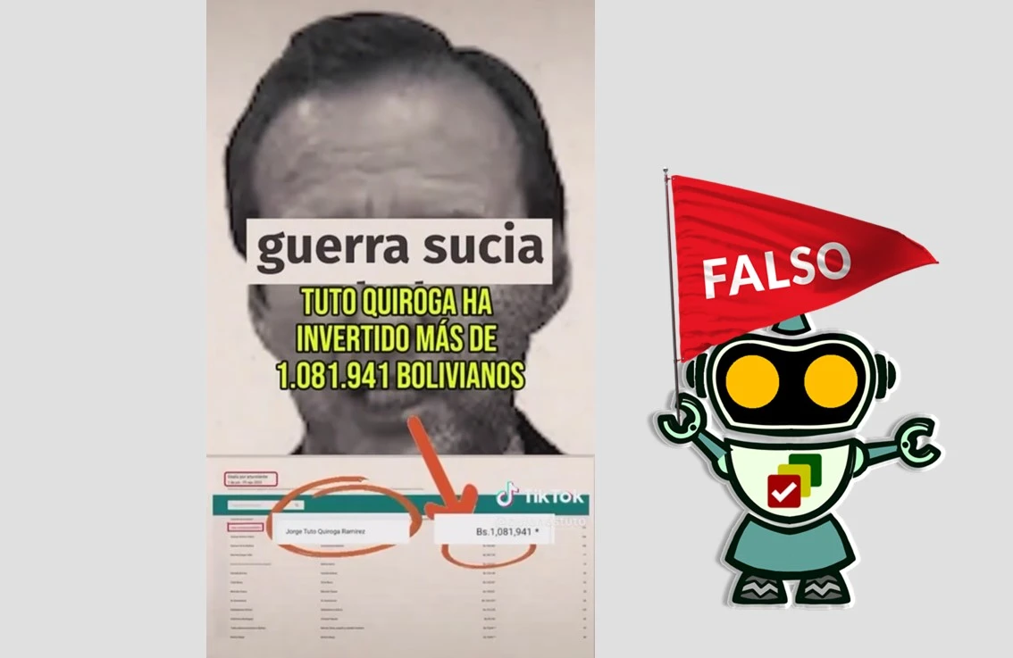 Es falsa la información de un video que circula en TikTok en el que se afirma que el candidato a la presidencia Jorge Tuto Quiroga (Alianza Libre) habría invertido más de un millón de bolivianos en publicidad en Facebook para hacer guerra sucia contra del binomio del Partido Demócrata Cristiano (PDC). Bolivia Verifica corroboró que dicha inversión corresponde únicamente a su propia campaña electoral y no para perjudicar a sus adversarios políticos Rodrigo Paz y Edmand Lara.
