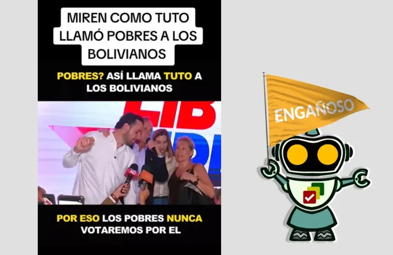 El material usa un fragmento real, pero omite partes clave del discurso y añade comentarios que no están dentro del material original. En TikTok circula un video con un texto que menciona que el candidato presidencial por Alianza Libre Jorge Tuto Quiroga llamó «pobres» a todos los bolivianos y que por eso la población no … Sigue leyendo Quiroga no llamó pobres a los bolivianos, las declaraciones que dio después del debate vicepresidencial fueron sacadas de contexto