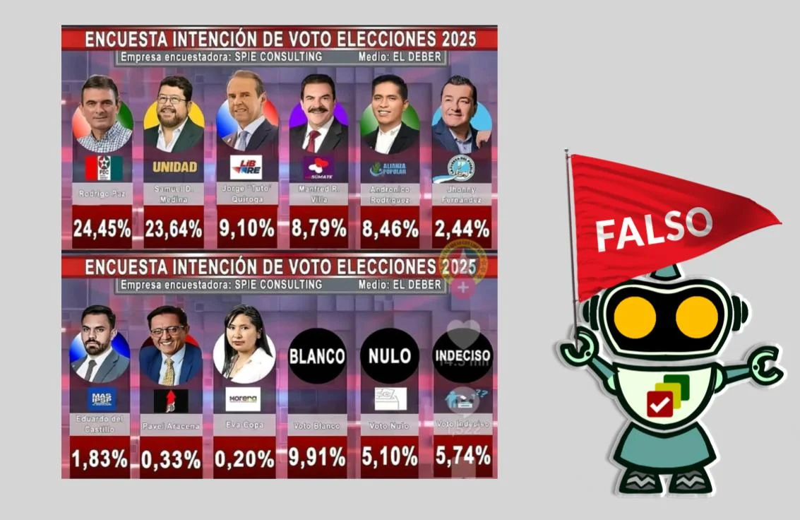 Por todo lo expuesto, es falso que una encuesta oficial hecha por Spie Consulting SRL y difundida por El Deber haya posicionado al candidato presidencial Rodrigo Paz Pereira en el primer lugar de intención de voto.