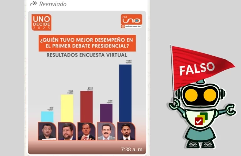 Usaron el logo y línea gráfica de Red Uno para difundir un contenido falso que no fue elaborado por dicho canal televisivo. Una imagen falsa con el logo de Red Uno se difunde por WhatsApp, afirmando que Eduardo del Castillo, candidato del Movimiento Al Socialismo (MAS), fue el ganador del debate presidencial del 6 de … Sigue leyendo Sondeo de desempeño en el debate presidencial atribuido a Red Uno es falso