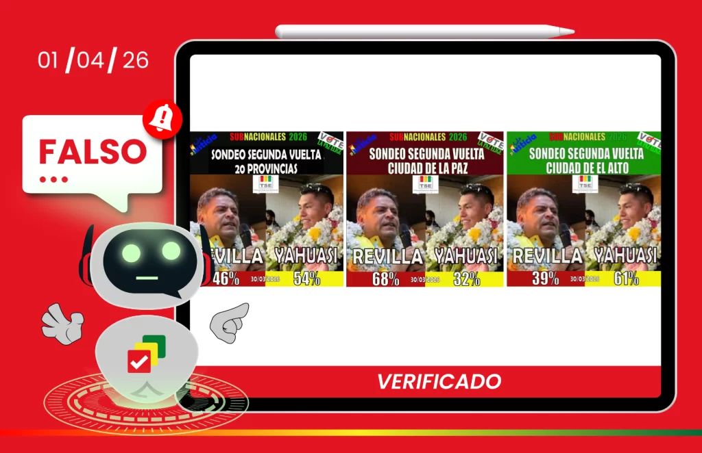 Tres sondeos de intención de voto para la Gobernación de La Paz difundidos en TikTok carecen de sustento técnico y no cuentan con aval del TSE. Además, utilizan su imagen institucional de forma indebida para engañar a los electores.ContentsNo cumple con los parámetros del TSELo que establece la normativa Una cuenta de TikTok difunde tres … Sigue leyendo Sondeos sin aval en TikTok usan el logo del TSE para desinformar