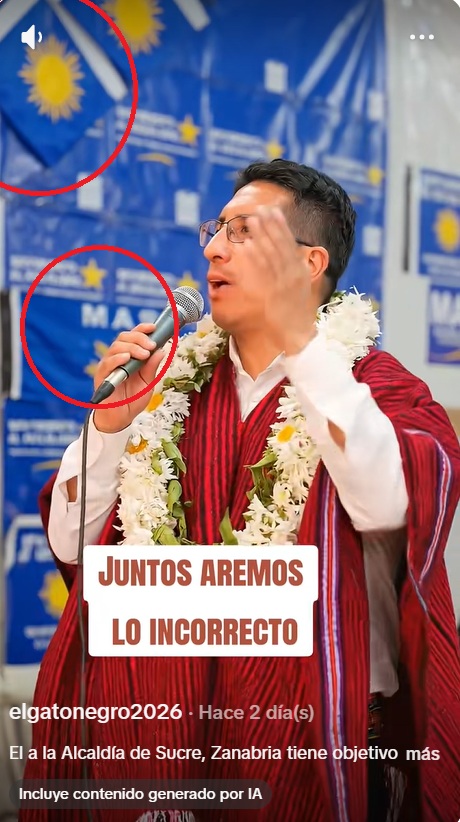«Soy Cristian Potoco Sanabria y, si gano, cerraré Puka Puka y echaré a los 400 perros a la calle. Esa es mi propuesta estrella», se escucha mencionar a Cristian Sanabria, candidato a la Alcaldía de Sucre por la agrupación Fuerza. Sin embargo, este video difundido desde la cuenta @elgatonegro2026 es falso. El material fue generado con inteligencia artificial (IA) desde una fotografía publicada el 2025.