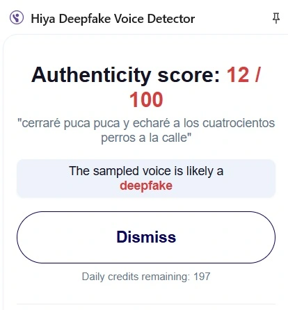 Bolivia Verifica analizó el audio de este material con la herramienta Hiya Deepfake Voice Detector y lo calificó con solo un 12 % de 100 de autenticidad real; es decir, tiene un 88 % de probabilidad de ser una deepfake.