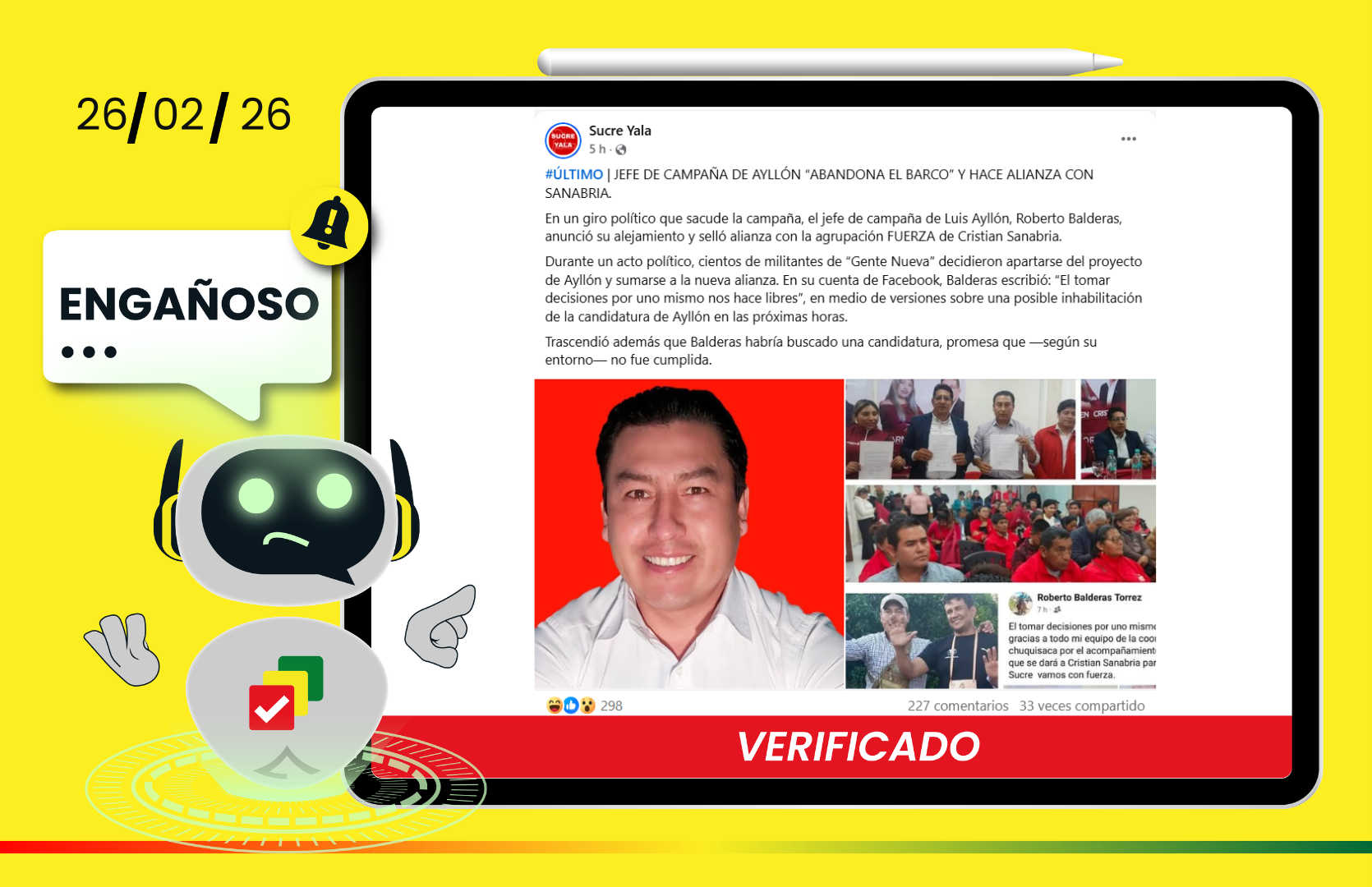 En la página de Facebook Sucre Yala se difundió una publicación afirmando que el «jefe de campaña de Gente Nueva abandonó el barco» para sumarse a la agrupación Fuerza. El post identifica en este rol a Roberto Balderas, quien aparece en fotografías junto al candidato a la Alcaldía de Sucre por Fuerza, Cristian Sanabria.