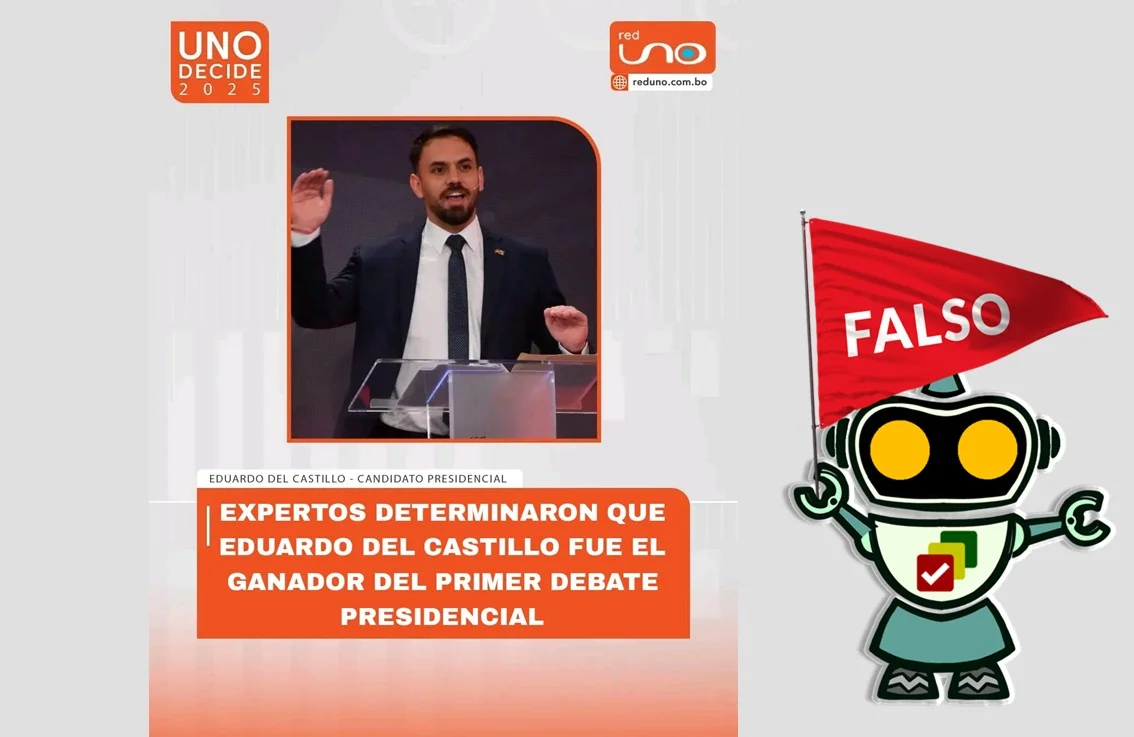 En grupos de WhatsApp circula una imagen que afirma que «expertos determinaron que Eduardo del Castillo fue el ganador del primer debate presidencial», organizado y transmitido por Red Uno de Bolivia. Sin embargo, este material no fue publicado por esa casa televisiva, por lo que se trata de una información falsa.