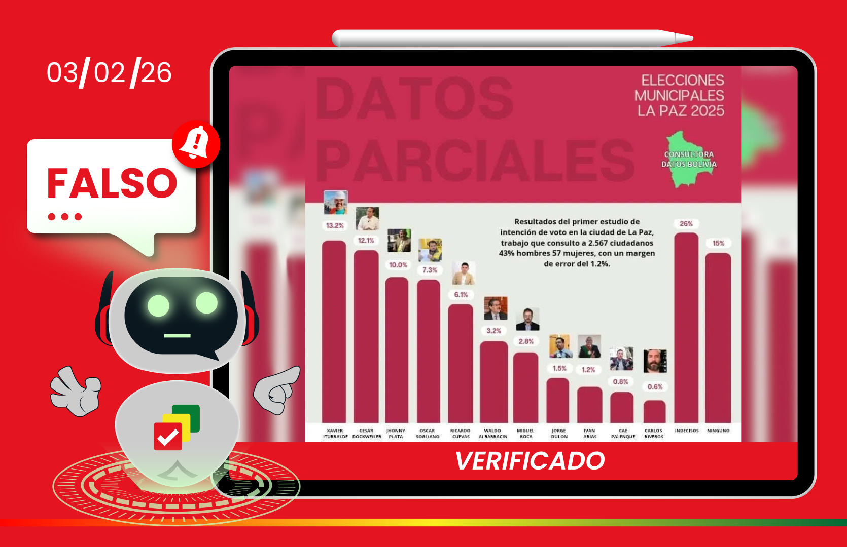 La imagen de una encuesta para la Alcaldía de La Paz no corresponde a un estudio real https://boliviaverificaelecciones.bo/la-imagen-de-una-encuesta-para-la-alcaldia-de-la-paz-no-corresponde-a-un-estudio-real/ Tue, 03 Feb 2026 21:30:19 +0000 https://boliviaverificaelecciones.bo/?p=13505 El gráfico presenta errores en la referencia al año electoral y atribuye el estudio a una consultora inexistente.