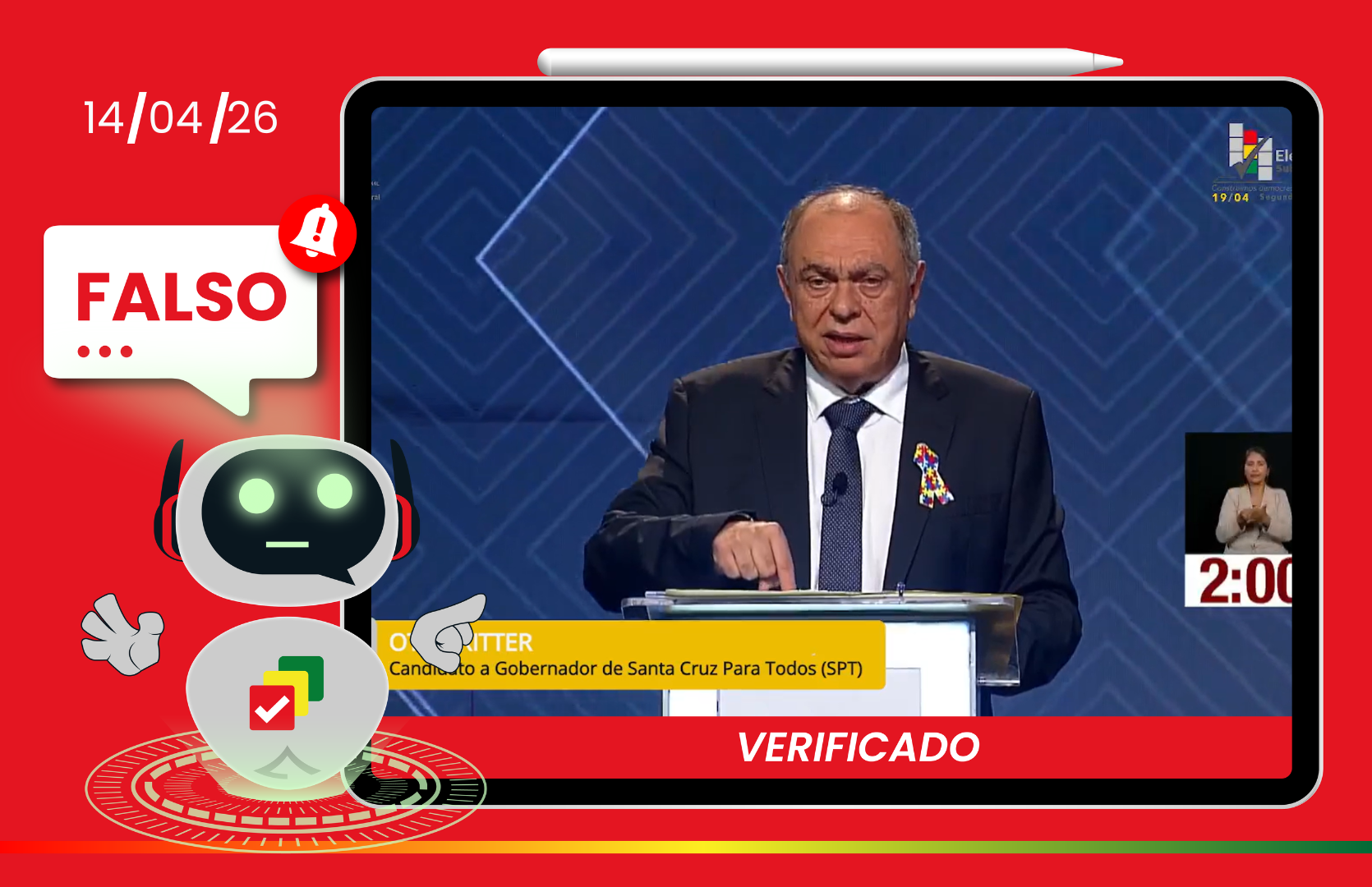 falso archivos - Bolivia Verifica Elecciones https://boliviaverificaelecciones.bo/tag/falso/ Bolivia Verifica Elecciones Mon, 20 Apr 2026 23:24:59 +0000 es hourly 1 https://wordpress.org/?v=6.9.4 https://boliviaverificaelecciones.bo/wp-content/uploads/2024/08/icono-150x150.jpg falso archivos - Bolivia Verifica Elecciones https://boliviaverificaelecciones.bo/tag/falso/ 32 32 Falso: atribuyen declaración a Otto Ritter contra Angélica Sosa por quedar en segundo lugar https://boliviaverificaelecciones.bo/falso-atribuyen-declaracion-a-otto-ritter-contra-angelica-sosa-por-quedar-en-segundo-lugar/ Mon, 20 Apr 2026 23:24:59 +0000 https://boliviaverificaelecciones.bo/?p=15938 La publicación presenta inconsistencias, ya que altera una imagen original de Red Uno. Tras obtener el 43% en la segunda vuelta, el contenido le atribuye a Otto Ritter una declaración que no dijo. Redacción: Aaron Carrasco A través de Facebook, la cuenta Lucas Reyes difundió una imagen con el logo de Red Uno en la […]