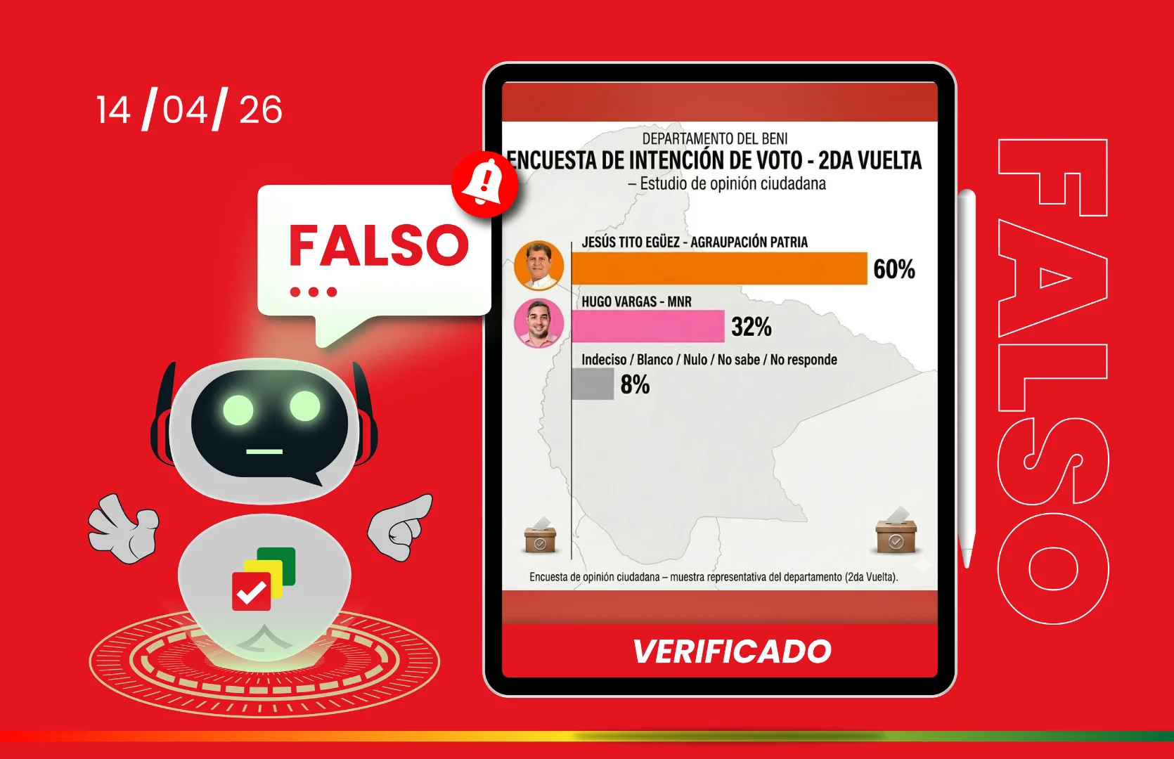 Es falsa la encuesta que otorga 60 % de intención de voto a Tito Égüez para la segunda vuelta en el Beni https://boliviaverificaelecciones.bo/es-falsa-la-encuesta-que-otorga-60-de-intencion-de-voto-a-tito-eguez-para-la-segunda-vuelta-en-el-beni/ Wed, 15 Apr 2026 00:18:45 +0000 https://boliviaverificaelecciones.bo/?p=15702 La pieza difundida en Facebook presenta datos sin ficha técnica y sin autorización del Tribunal Supremo Electoral, por lo que no puede considerarse una encuesta válida. Una publicación difundida en Facebook por la página “Beni en Acción”, y compartida en la página “Beni Noticias”, presenta una encuesta de intención de voto para la segunda vuelta […]