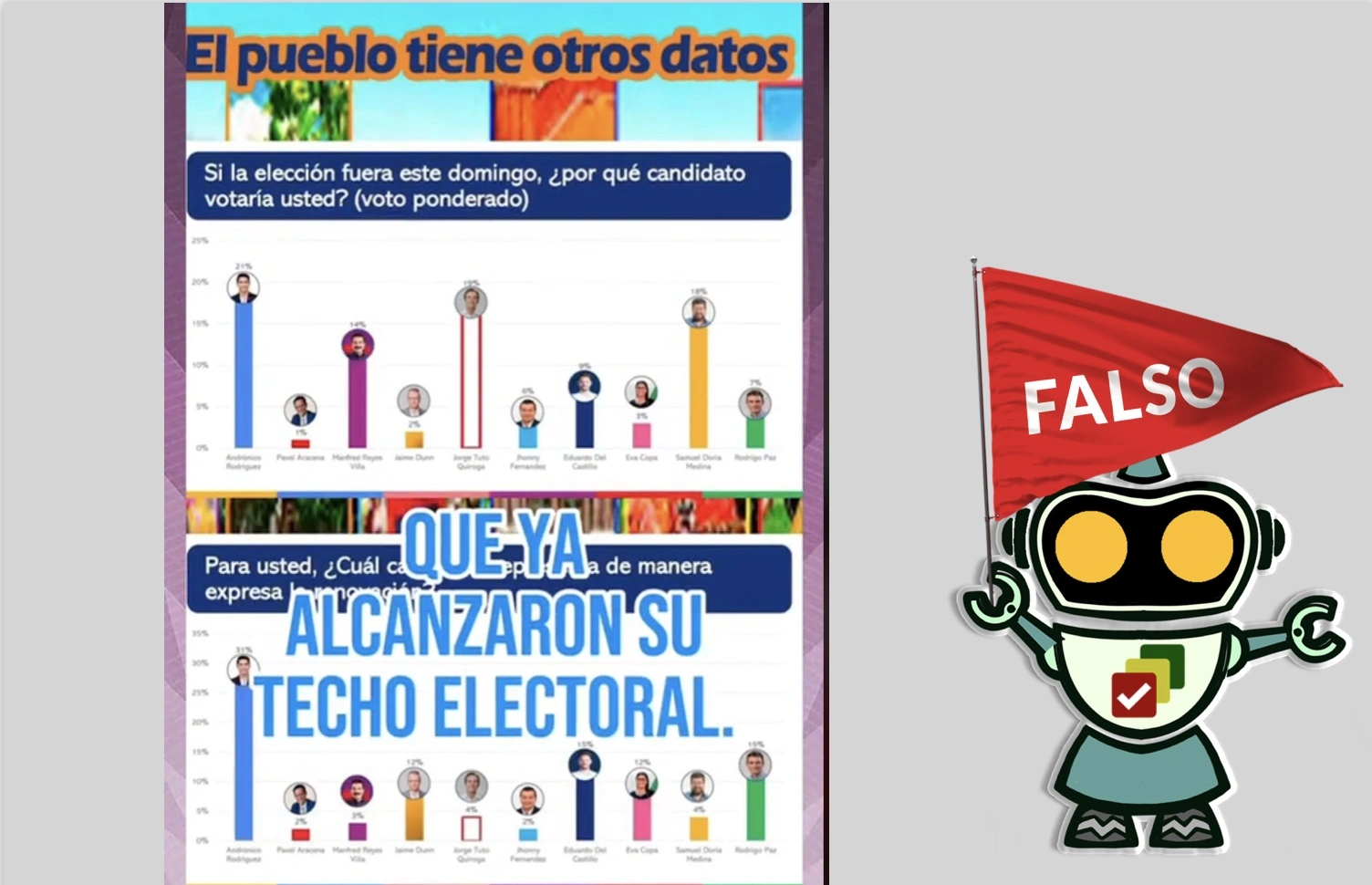 Por otro lado, cuentas desinformantes también aprovecharon el debate presidencial organizado por la Red Uno para difundir sondeos falsos. En un primer caso, una imagen manipulada dio como ganador al candidato por el Movimiento Al Socialismo (MAS) Eduardo del Castillo. Y en otra publicación con similares características se favoreció a Jorge Quiroga de Alianza Libre.