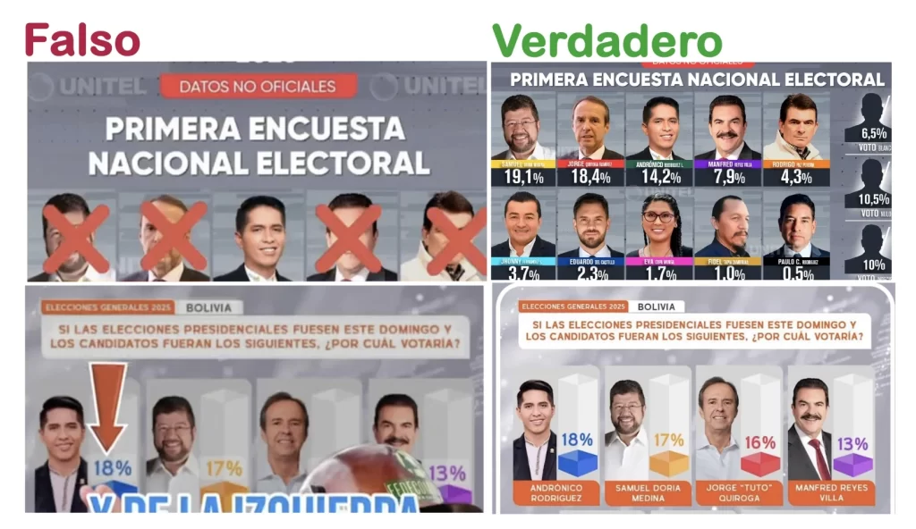 Encuestas y sondeos falsos, la estrategia de los desinformantes para manipular a la opinión pública https://boliviaverificaelecciones.bo/encuestas-y-sondeos-falsos-la-estrategia-de-los-desinformantes-para-manipular-a-la-opinion-publica/ Wed, 16 Jul 2025 20:06:07 +0000 https://boliviaverificaelecciones.bo/?p=8370 La segunda semana de julio, la tendencia de desinformación se concentró en diseminar encuestas y sondeos manipulados con el objetivo de incidir en la ciudadanía. Ante la proximidad de las elecciones y la intensificación de las campañas, los medios de comunicación ya muestran su despliegue de cobertura con la difusión de encuestas autorizadas por el […]