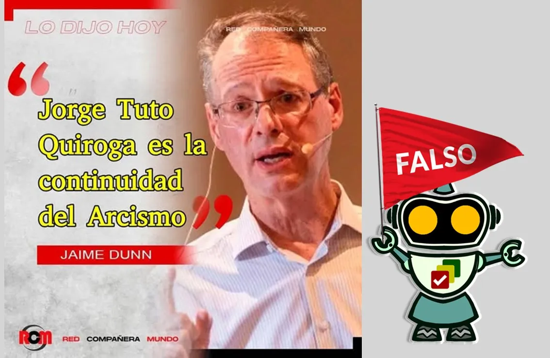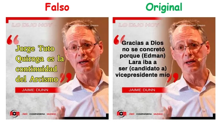 En el escenario electoral, al analista financiero y exprecandidato Jaime Dunn de Ávila se le atribuyó la frase: “Jorge Tuto Quiroga es la continuidad del Arcismo” en una imagen difundida en Facebook y que fue categorizada como falsa. Además el contenido utilizó la línea gráfica de 2022 de la radio Red Compañera Mundo (RCM).