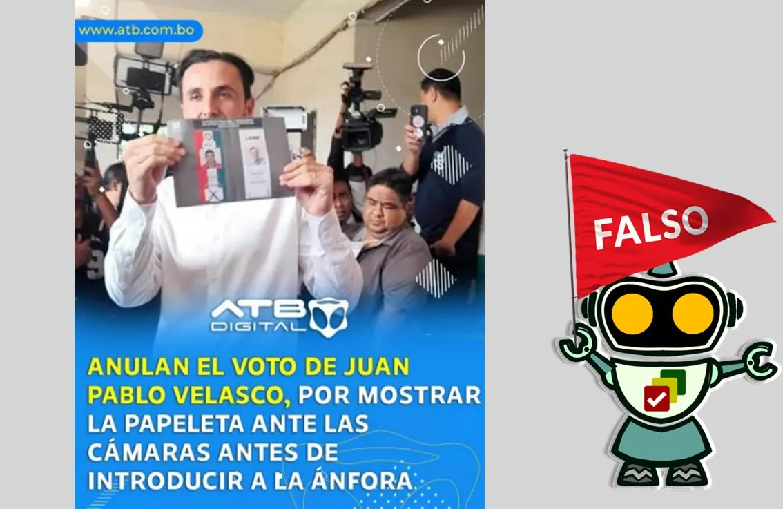 Mediante la cuenta @bolivia_al_instante en TikTok se compartió una fotografía con la línea gráfica ATB Digital, en la que muestra al candidato vicepresidencial de Alianza Libre, Juan Pablo Velasco mostrando su papeleta de votación marcada a favor del binomio del Partido Demócrata Cristiano (PDC). Según la descripción, esta acción habría anulado su voto. No obstante, tanto la imagen como el texto son falsas.