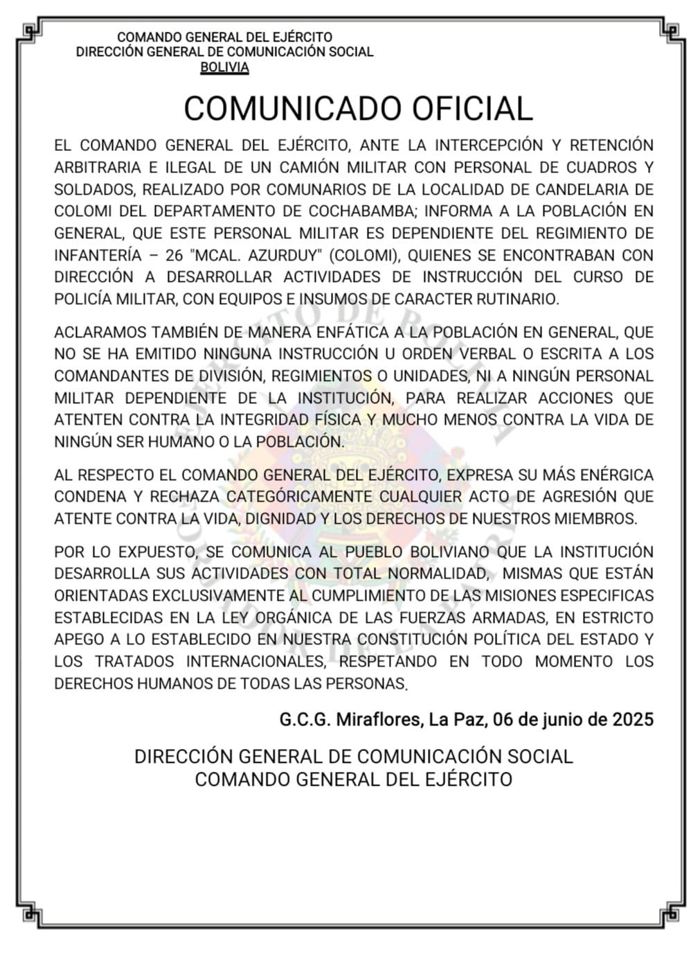 En ese comunicado, la institución aclaró que el personal afectado era del Regimiento de Infantería XXVI Mariscal Azurduy. El anuncio indicaba que los militares interceptados se dirigían a sus actividades de instrucción del curso de policía militar. «Aclaramos de manera enfática a la población en general que no se ha emitido ninguna instrucción u orden verbal o escrita a los comandantes de división, regimientos, unidades, ni ningún personal militar dependiente de la institución para realizar acciones que atenten contra la integridad física y mucho menos contra la vida de ningún ser humano», se lee.
