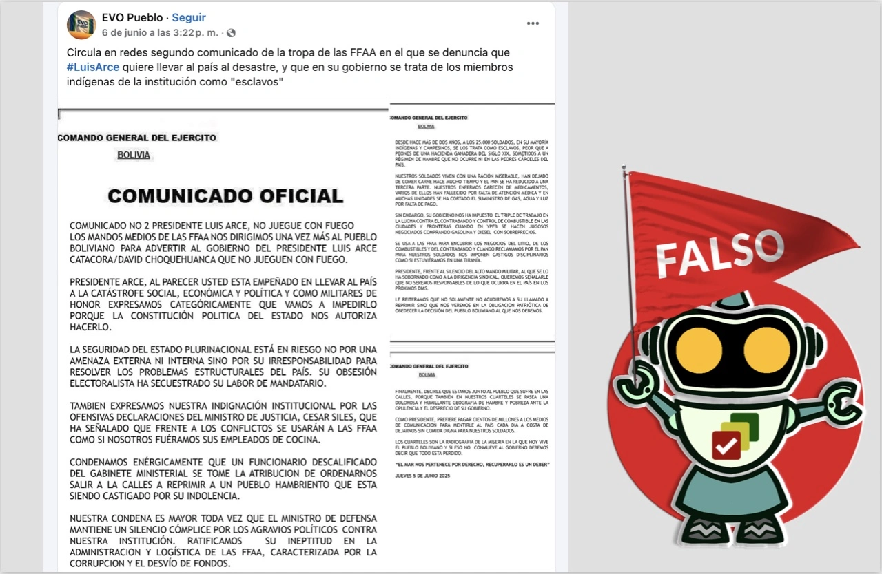 «Presidente, no seremos responsables de lo que ocurra en el país en los próximos días», dice parte de un comunicado difundido en redes sociales a nombre del Comando General del Ejército, donde además se acusa a Luis Arce Catacora de llevar al país a un «desastre económico» y de tratar a los indígenas de la institución militar como «esclavos»; sin embargo, este contenido es falso, no se trata de un documento emitido por las Fuerzas Armadas (FFAA) de Bolivia