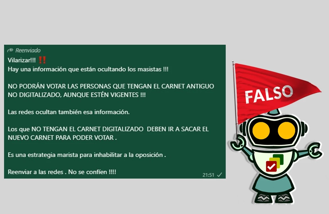 Es falso que se deba presentar el carnet digitalizado para votar en las elecciones del 17 de agosto https://boliviaverificaelecciones.bo/es-falso-que-se-deba-presentar-el-carnet-digitalizado-para-votar-en-las-elecciones-del-17-de-agosto/ Tue, 15 Jul 2025 23:17:29 +0000 https://boliviaverificaelecciones.bo/?p=8349 El reglamento aprobado por el TSE para las Elecciones Generales 2025 establece que las y los ciudadanos podrán sufragar presentando su cédula de identidad en formato físico o digital. En grupos de WhatsApp circula un mensajes alarmista en sentido de que los electores solo podrán votar si cuentan con la cédula de identidad digitalizada. Sin […]