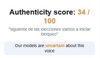 • El detector de voz Hiya estableció que el audio tiene una autenticidad de 34 sobre 100%. Por lo que se lo declara como falso.