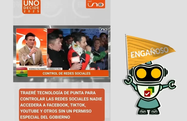 El candidato habló de fortalecer la democracia y regular delitos en redes sociales, no de bloquearlas.ContentsDeclaración de Rodrigo PazRastreo en Red UnoContexto En Facebook circula una imagen con el logo de Red Uno en la que se atribuye a Rodrigo Paz, candidato presidencial por el Partido Demócrata Cristiano (PDC), una supuesta declaración sobre la implementación … Sigue leyendo Tergiversan declaraciones de Rodrigo Paz sobre redes sociales: no habló de permisos especiales