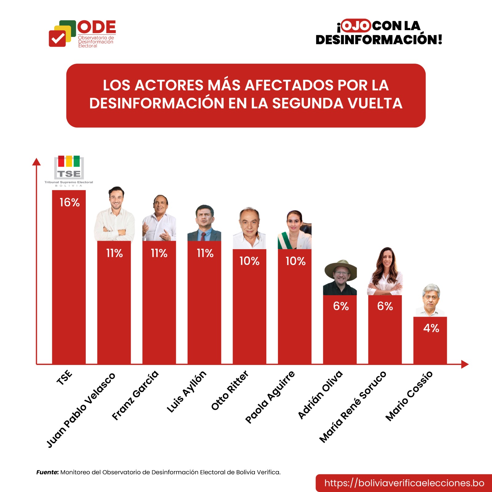 Como ya sucedió en la primera vuelta, el Tribunal Supremo Electoral (TSE) fue uno de los más afectados por la desinformación, en este caso con un 16%, seguido del gobernador electo de Santa Cruz, Juan Pablo Velasco Dalence con el 11%, y en tercer lugar Franz García con el 11% al igual que Luis Ayllón ambos candidatos en Chuquisaca, con el mismo porcentaje, 11%.