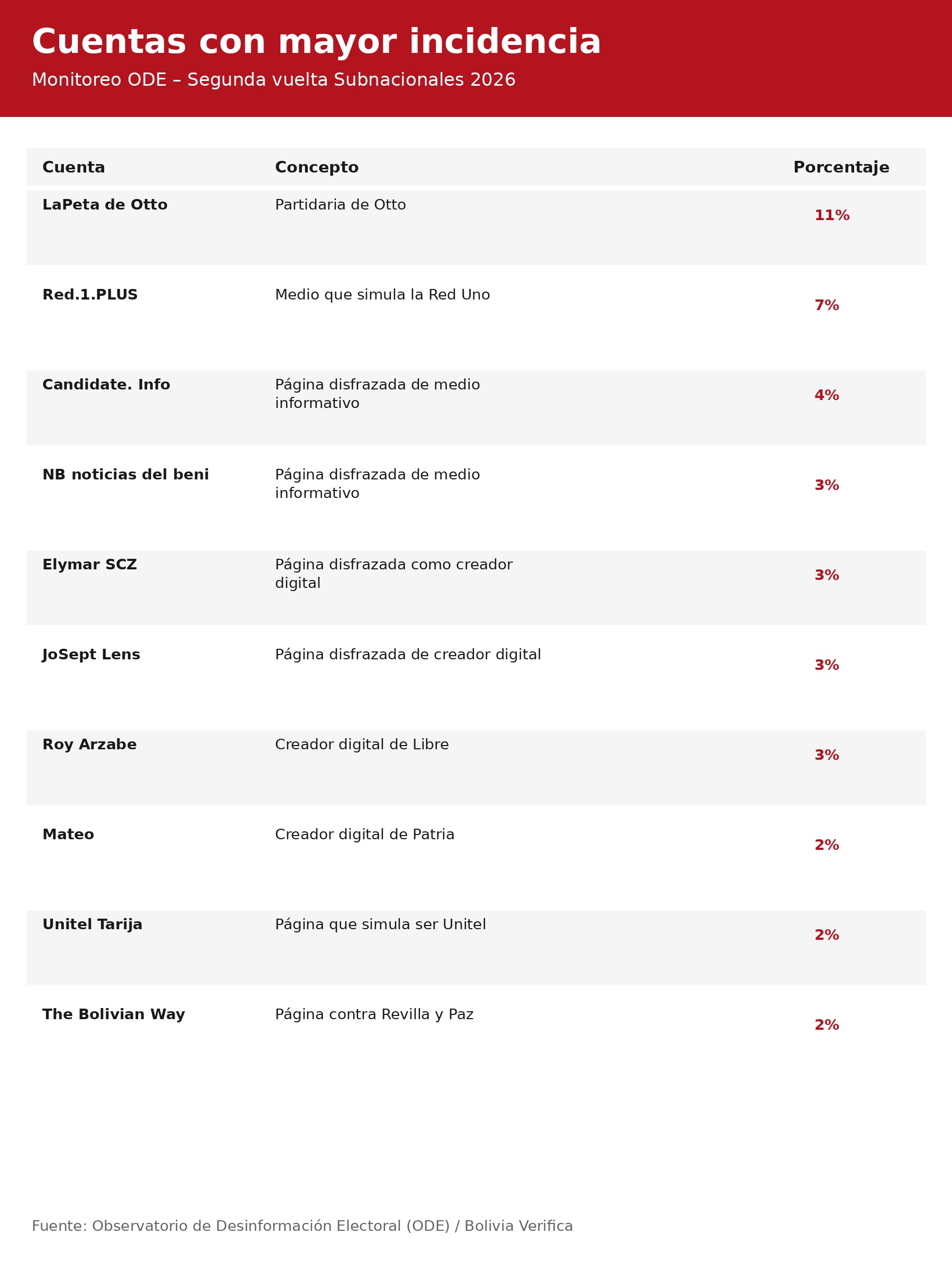 Por ejemplo, se hizo viral una falsa publicación con “datos preliminares” atribuida a Red Uno sobre la segunda vuelta en Chuquisaca. En Facebook, la cuenta “Soy Chuquisaqueño” difundió un gráfico con la identidad corporativa de este medio ubicando a Luis Ayllón Salguero de Alianza Gente Nueva con el 51,3% y a Franz García de Alianza Patria Unidos con el 28,6%. Ningún ente oficial avaló este contenido. Ver aquí.