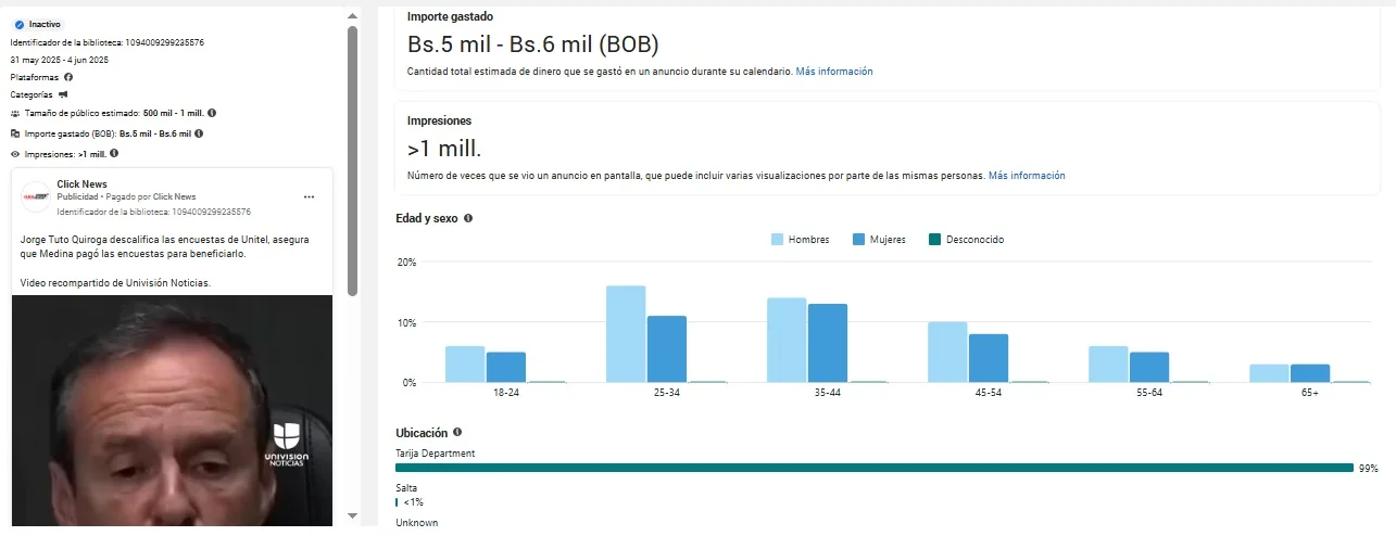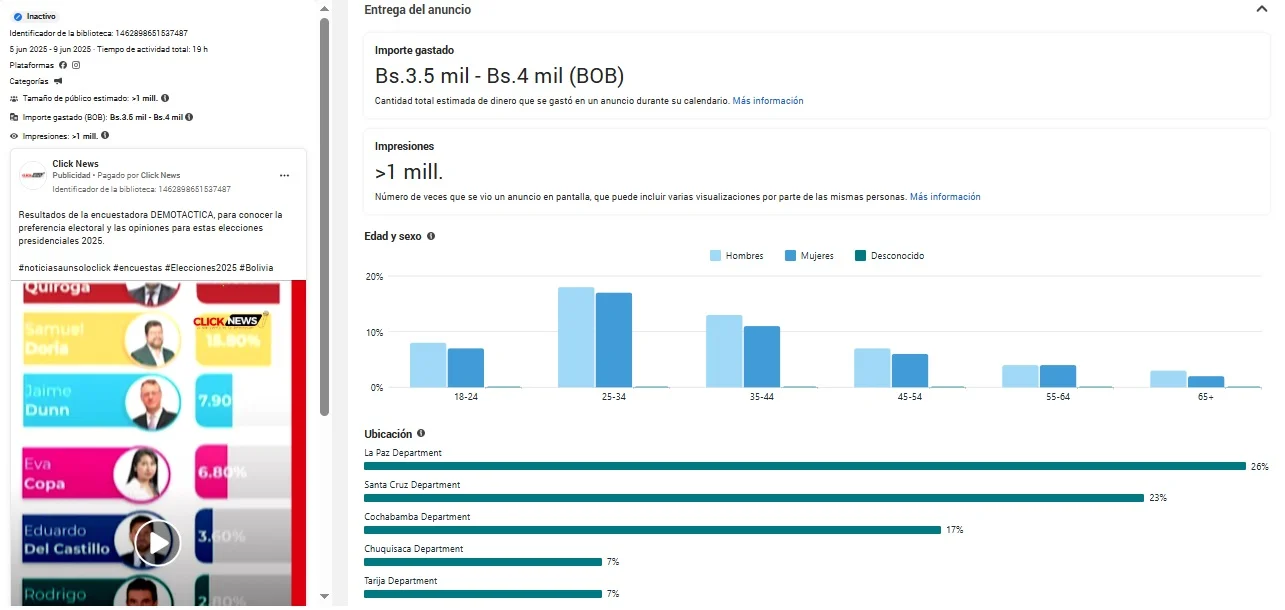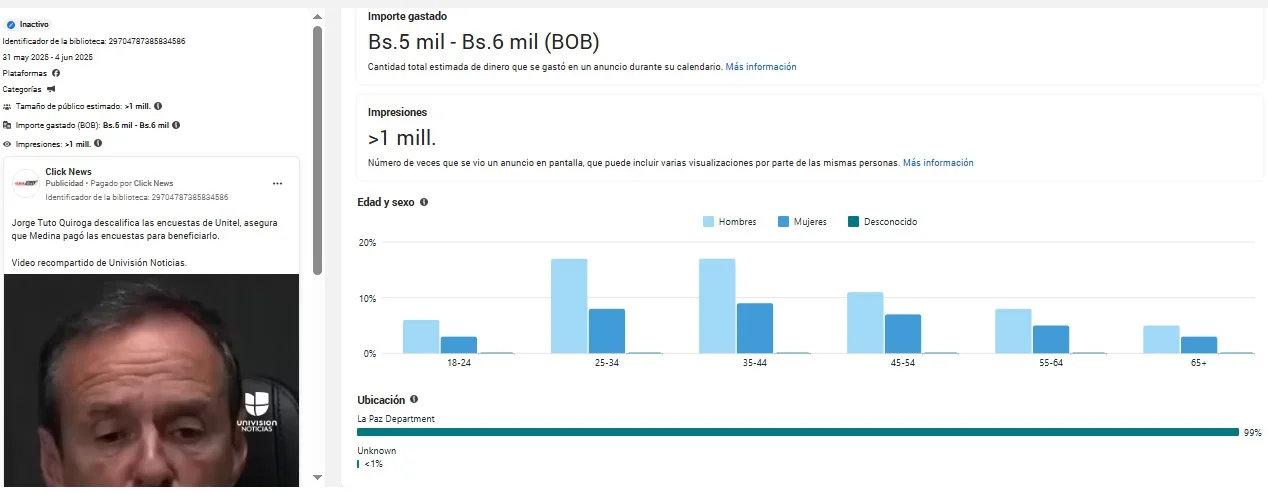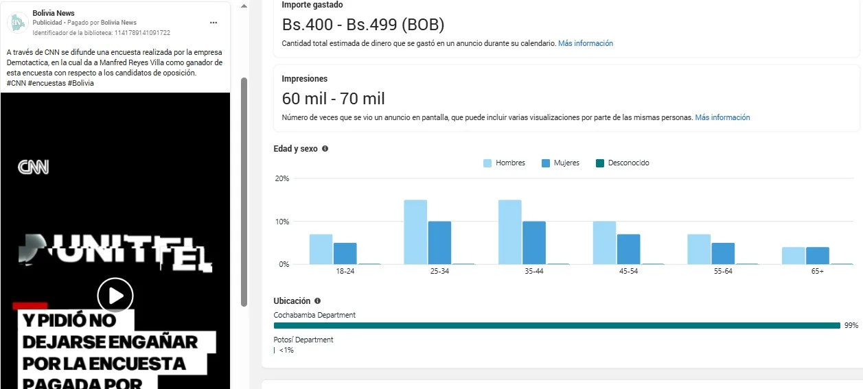 El video fabricado fue publicado como publicidad entre el 11 y 16 de julio de 2025 con una inversión de Bs 9.000, direccionado a un millón de usuarios en todo el país.